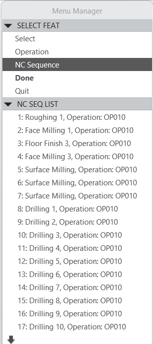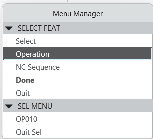 2- In the Menu Manager window that opens, there are two alternatives under Select Feat. By selecting the desired operations using NC Sequence, an NCL output can be generated. Alternatively, by using the Operation option, an NCL output can be generated for all operations under the Main Program.